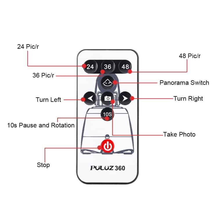 2. Panoramic Head is controlled by the supplied infrared controller instead of the smart phone. The base only has power on/off switch. The remote control can be paired to your smartphone via Bluetooth, given that the smartphone system is above Android 3.0 or iOS 4.0. Take a panoramic picture press the photo capture button on the remote control to trigger the smartphone. (Note: Remote control capture function is only used to control the phone to take pictures, not available for shooting video operation, video mode only for rotation angle)