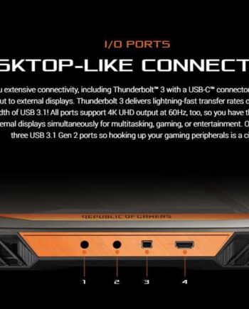 Description : G703 is a beast with the power to take on today’s gaming desktops, thanks to its factory-overclocked 8th Generation Intel® Core™ i9 processor and NVIDIA® GeForce RTX™ 2080 graphics. Designed to play the latest AAA titles on Ultra graphics settings, this powerful Windows 10 Pro laptop features an IPS-level display with a 144Hz refresh rate and ultrafast 3ms gray-to-gray (GTG) response time for smooth visuals with little or no motion blur. ROG-exclusive software lets you switch between an Optimus power-saving mode or NVIDIA G-SYNC™ to experience the smoothest gameplay without stuttering and visual tearing. G703 speeds up loading times with its three NVMe® PCI Express® SSDs in RAID 0 configuration offering read speeds of up to 8700MB/s — the fastest storage ever found on a laptop. Its wireless performance goes above and beyond today’s networking standards; a 2.5G port delivers speeds more than twice the industry while Intel Gigabit Wi-Fi reaches up to 1.7Gbps — 12X-faster than 802.11b/g/n1!
