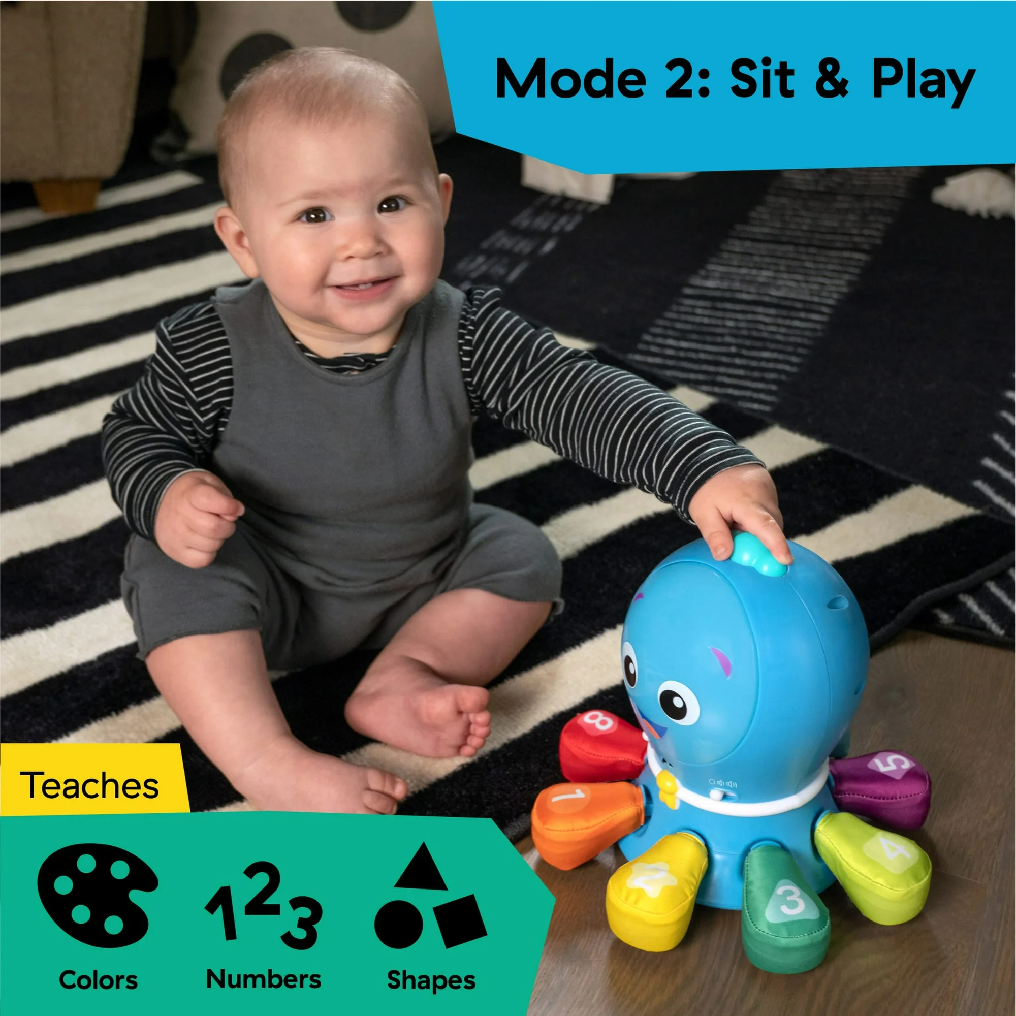 • The Baby Einstein Ocean Explorers Go Opus Go 4-in-1 toy features 4 modes – Tummy Time, Sit & Play, Chase, and Dance; grows with baby’s physical and cognitive needs from infant to preschool