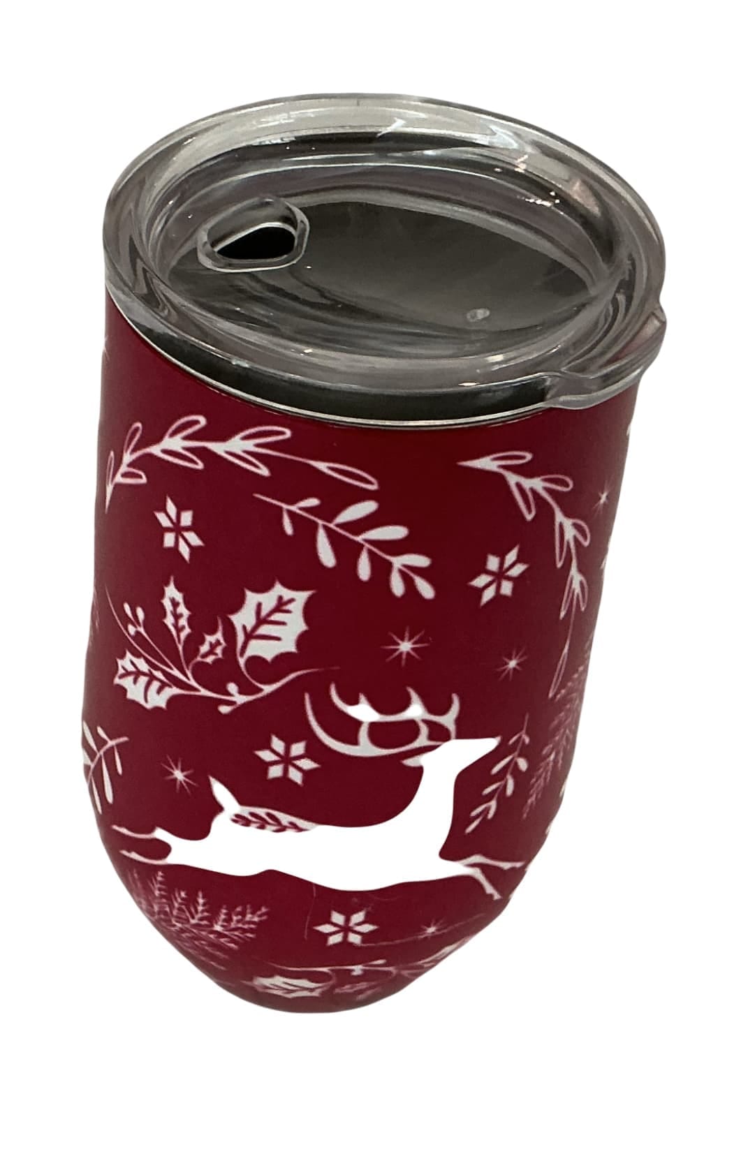 Enjoy your beverage at home and on the road with this winter themed travel mug. The mug is lined in red with white snowflakes with a lid.