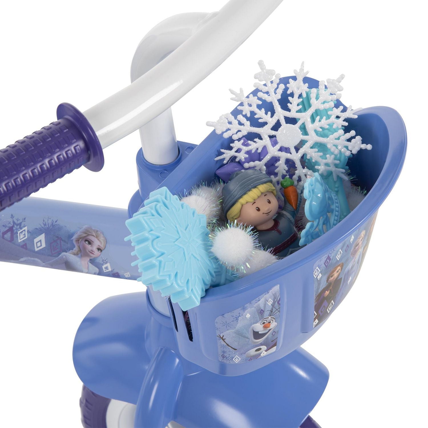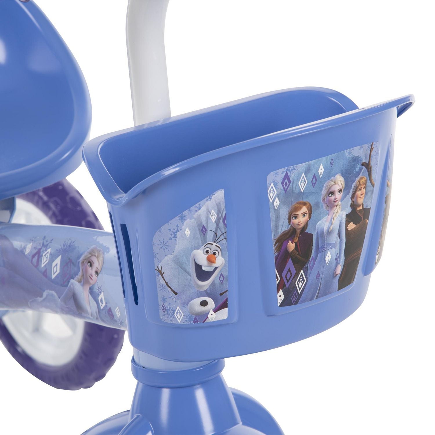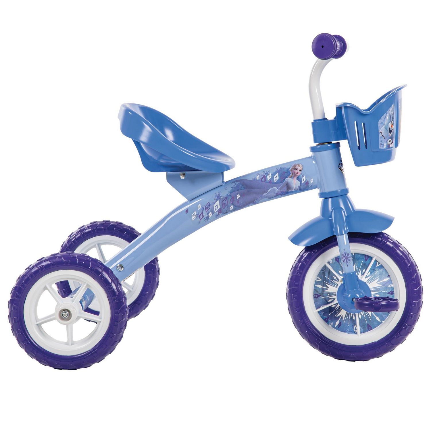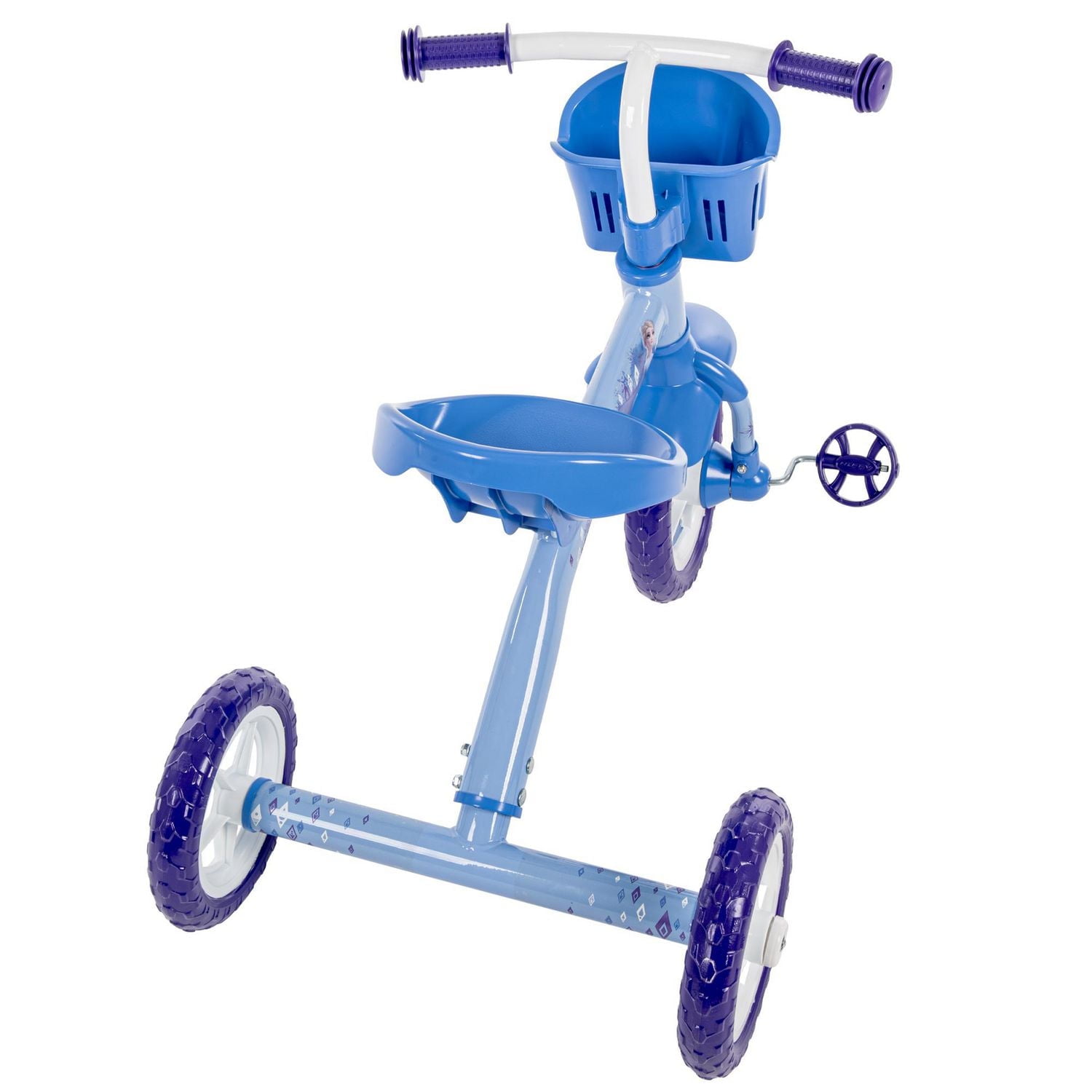 Magical adventures up ahead with this girls’ Disney Frozen trike from Huffy. Perfect for your younger rider, the trike helps her learn how to pedal and steer while giving her stability and confidence atop 3 stable wheels. She is sure to love riding along with the beloved Disney Frozen characters like Elsa, Anna, Olaf, and Kristoff! The blue and purple trike for girls is decorated with whimsical wintry details from the frame to the wheel insert. The trike’s seat has a back to keep your little one comfortable as they ride, and the soft purple grips are the right size for little hands. To ensure your Frozen-lover has everything she needs for her adventure, the front basket is the perfect addition. Your little girl is ready for a ride to Arendelle!