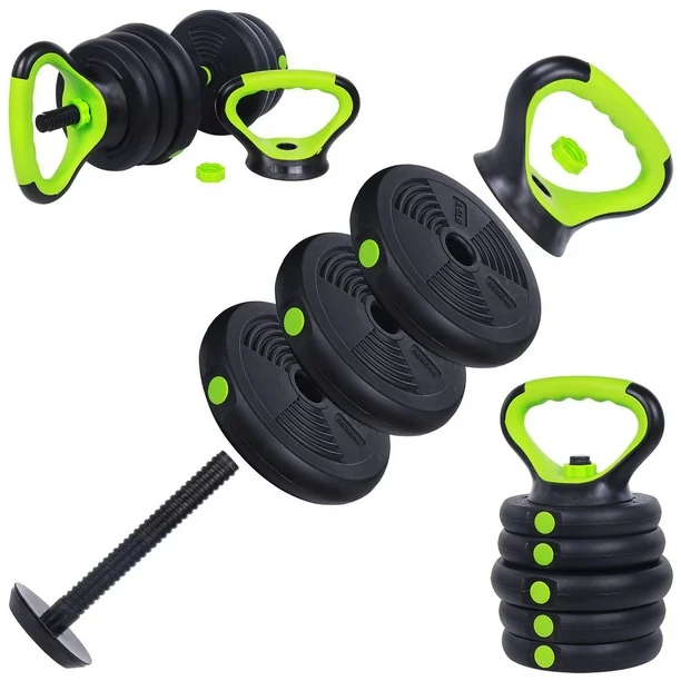 • Set includes: (4) 2.75 lb weight plates, (4) 3.3lb weight plates, (6) 4.4 lb weight plates, (2) dumbbell handles, (2) kettlebell grips, (4) safety nuts, (1) kettlebell base, (1) barbell connecting rod