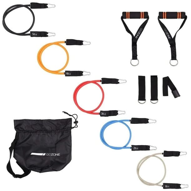 • Resistance band training is a more controlled alternative to lifting traditional free weights. With the GoZone all-in-one resistance band set, you’ll have all the gear you need for a full body, resistance-based workout. Use multiple bands at once to create a resistance level that gives you the kind of workout you want, whether you’re toning muscles and improving flexibility, or looking to bulk up. With this fitness band set, you can get the same results as you would from a heavy, and space-consuming free weight set. Add a number of efficient exercise options to your home gym with this multi-band resistance set.