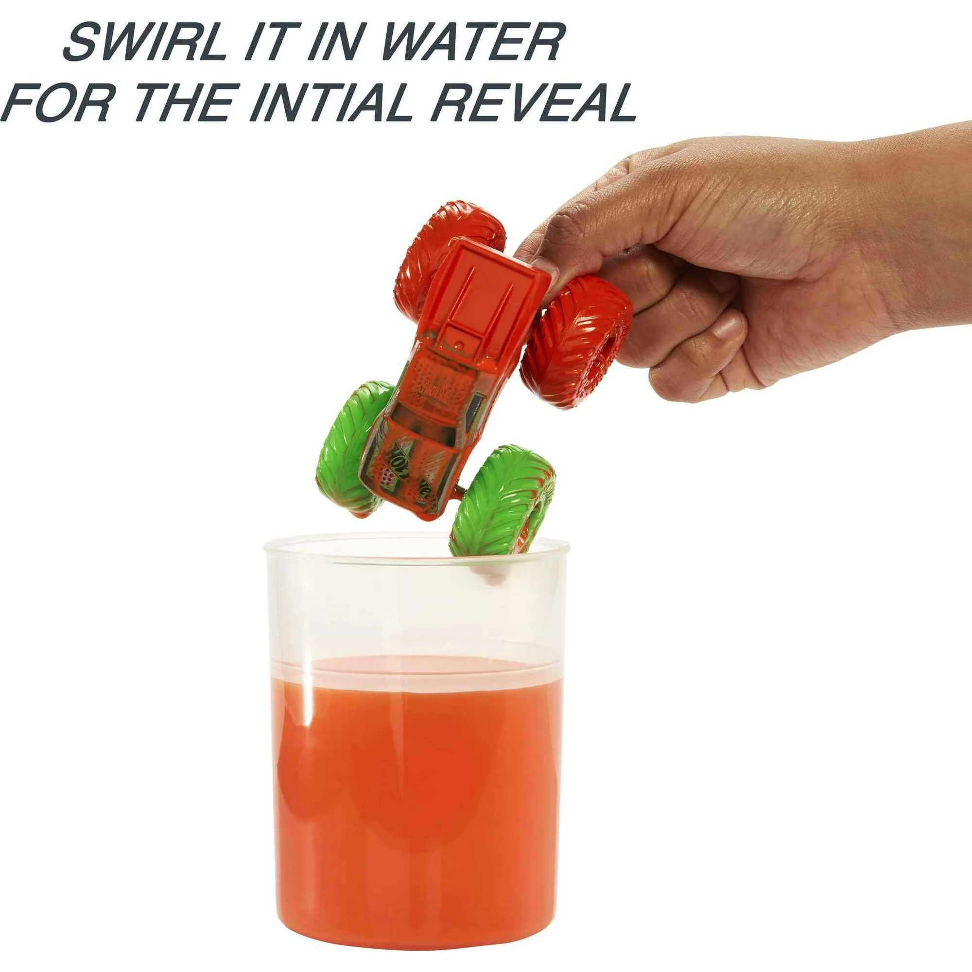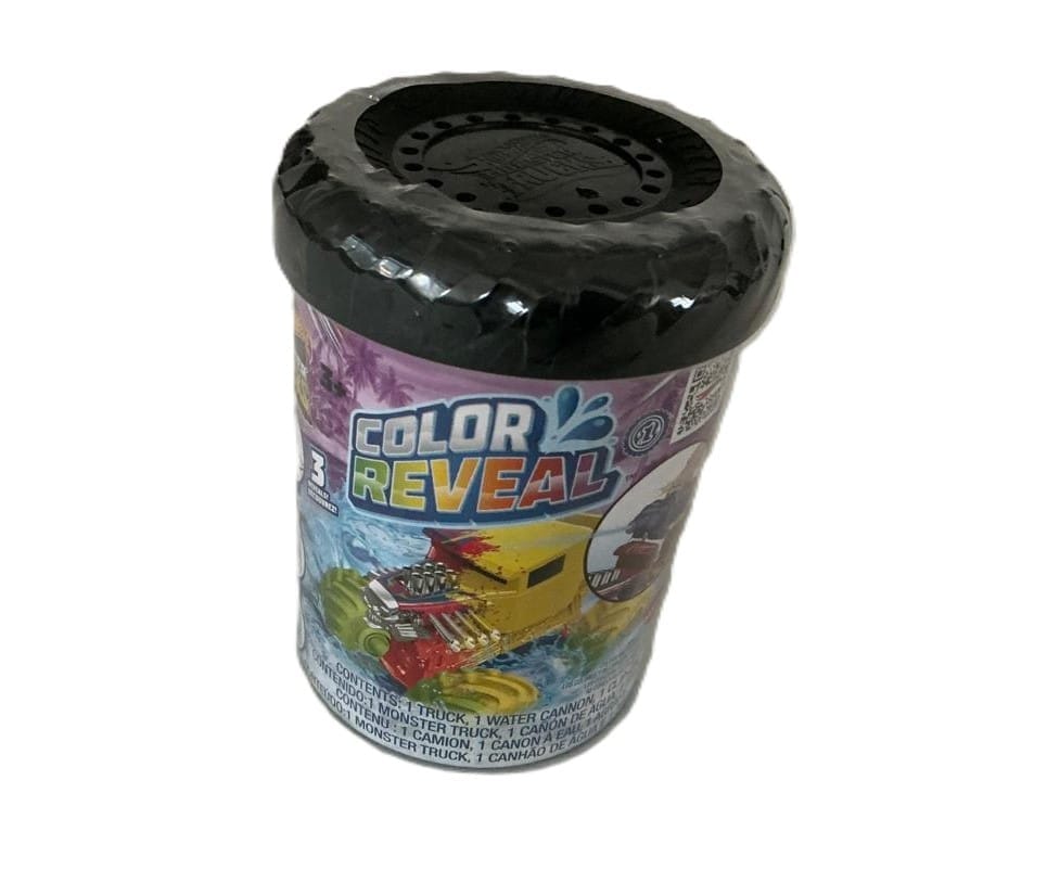 Unscrew the lid on the Hot Wheels Monster Trucks Color Reveal container and discover a 1:64 scale Color Shifters Monster Truck covered in special Color Reveal coating, an additional cup for color shifting and a crushed car water blaster. For the initial reveal, fill the larger container with water, twist on the lid and shake it. Once the water changes color, unscrew the top and pull out a fresh Monster Truck with a sweet deco! Fill the cups with very warm and icy cold water and alternate dunks into each one to shift the truck’s colors again and again. Fill the crushed car water blaster with icy cold or very warm water and spray Color Shifters trucks for creative deco-changing water blasts. Kids will want the entire collection. Each sold separately, subject to availability. Colors and decorations may vary.