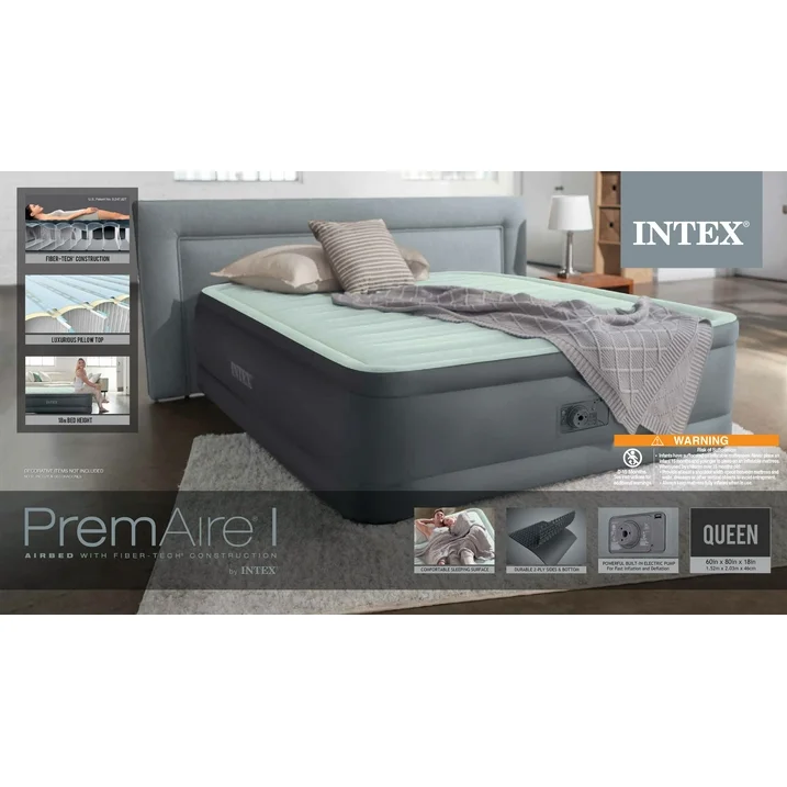 Intex 18″ Queen Dura Beam Premaire Elevated Airbed Mattress with Built-In Pump