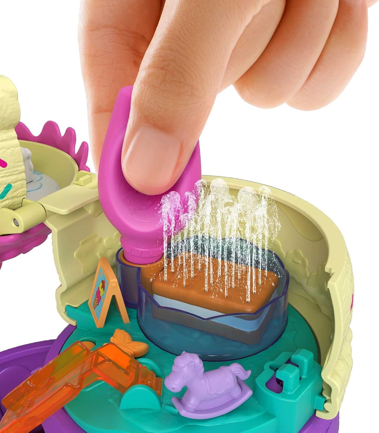Get ready for Theme Park Adventures with Polly Pocket. The super-sweet Spin ‘n Surprise Playground is shaped like an ice cream cone and has a lid that opens and 3 levels that spin out to reveal 3 floors of fun. The playset also features 25 themed surprises including micro Polly and Lila dolls and Polly’s dog Peaches (each doll has 5 movable joints for pose and play action). Get the fun started at the Playground that includes a hot air balloon; a banana split see-saw; ice cream sandwich and ice cream cone fountains (use the syrup bottle accessory, fill with water and place in the ice cream sandwich top to shoot water up or in the ice cream cone to make water come down); and a sliding pole. Some accessories have a Pop & Swap peg feature that can be placed in different areas of the playset for even more versatility. Kids can play out Playground adventures inside or outside of the playset with the accessories and then easily pack it up to take on the go. Playset also includes a long shoulder strap to carry it like a purse, too. Colors and decorations may vary. Dolls cannot stand alone. Makes a better for ages 4 years old and up.