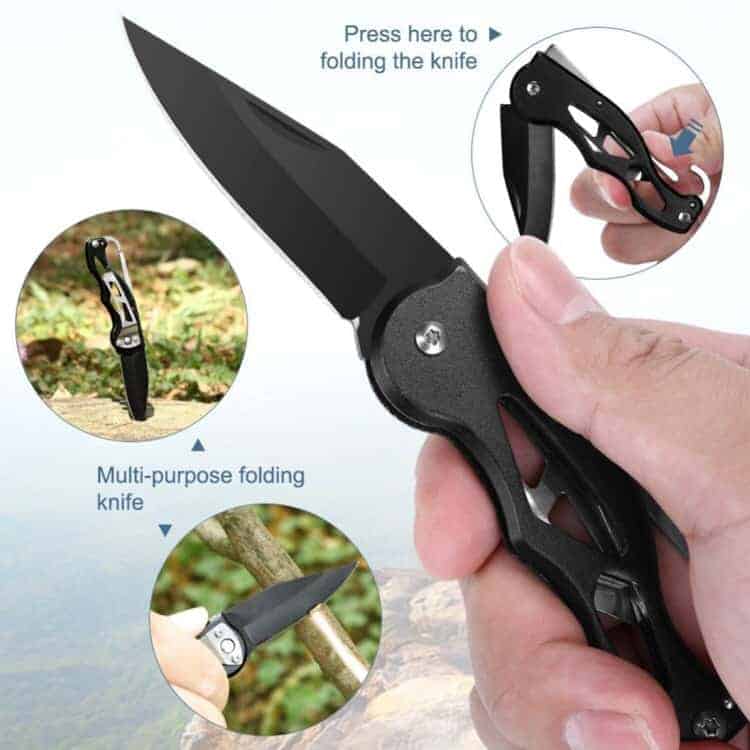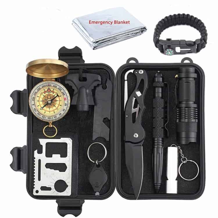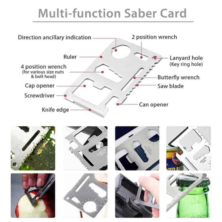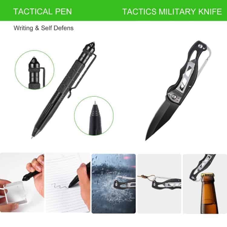 4. The tool box includes: Compass, Saber cards, Scraper, Portable Mini Light, Multi-function Knife, Tungsten Steel Pen, Whistle, Flshinght, 5 in 1 Multi-function Survival Bracelet, Emergency Blanket.