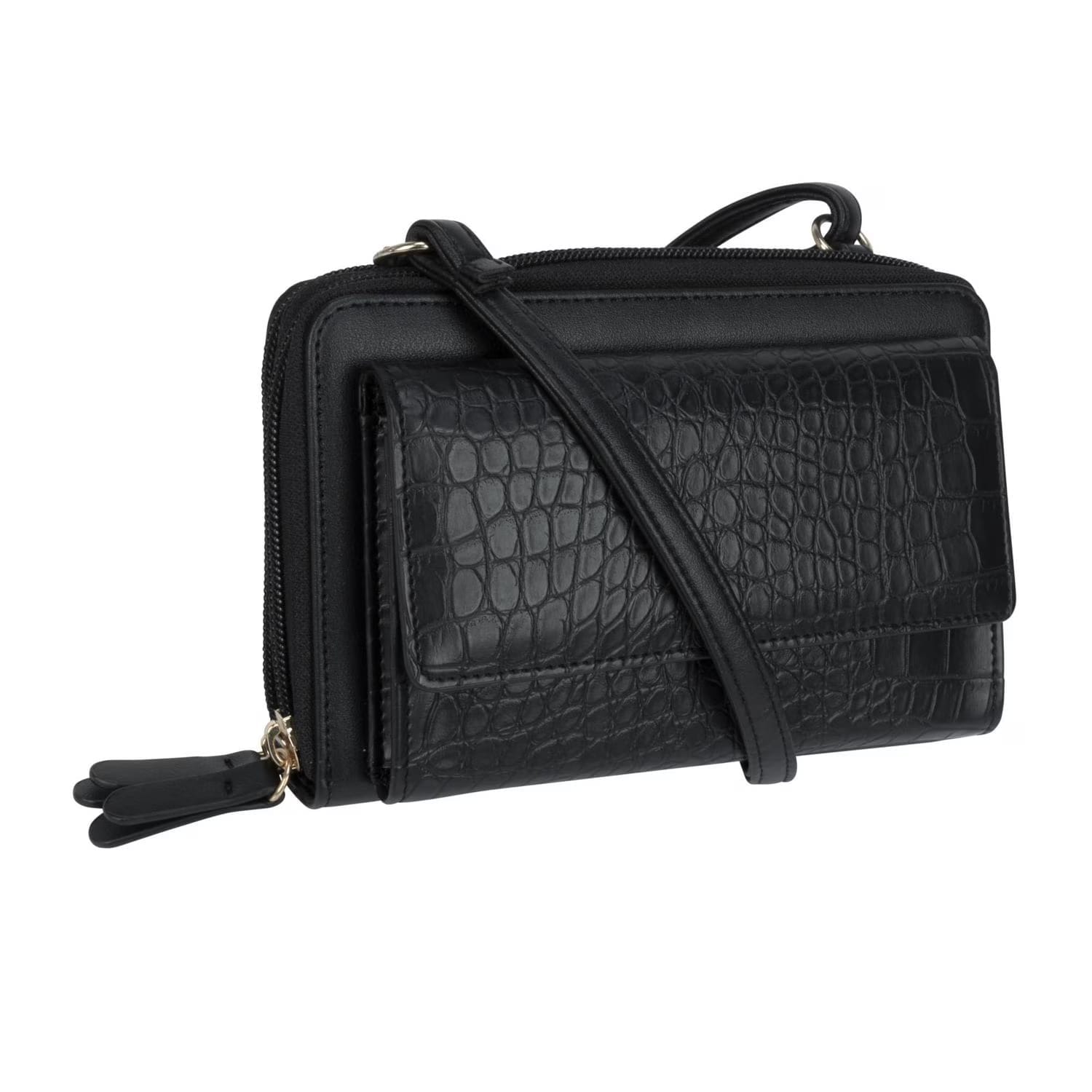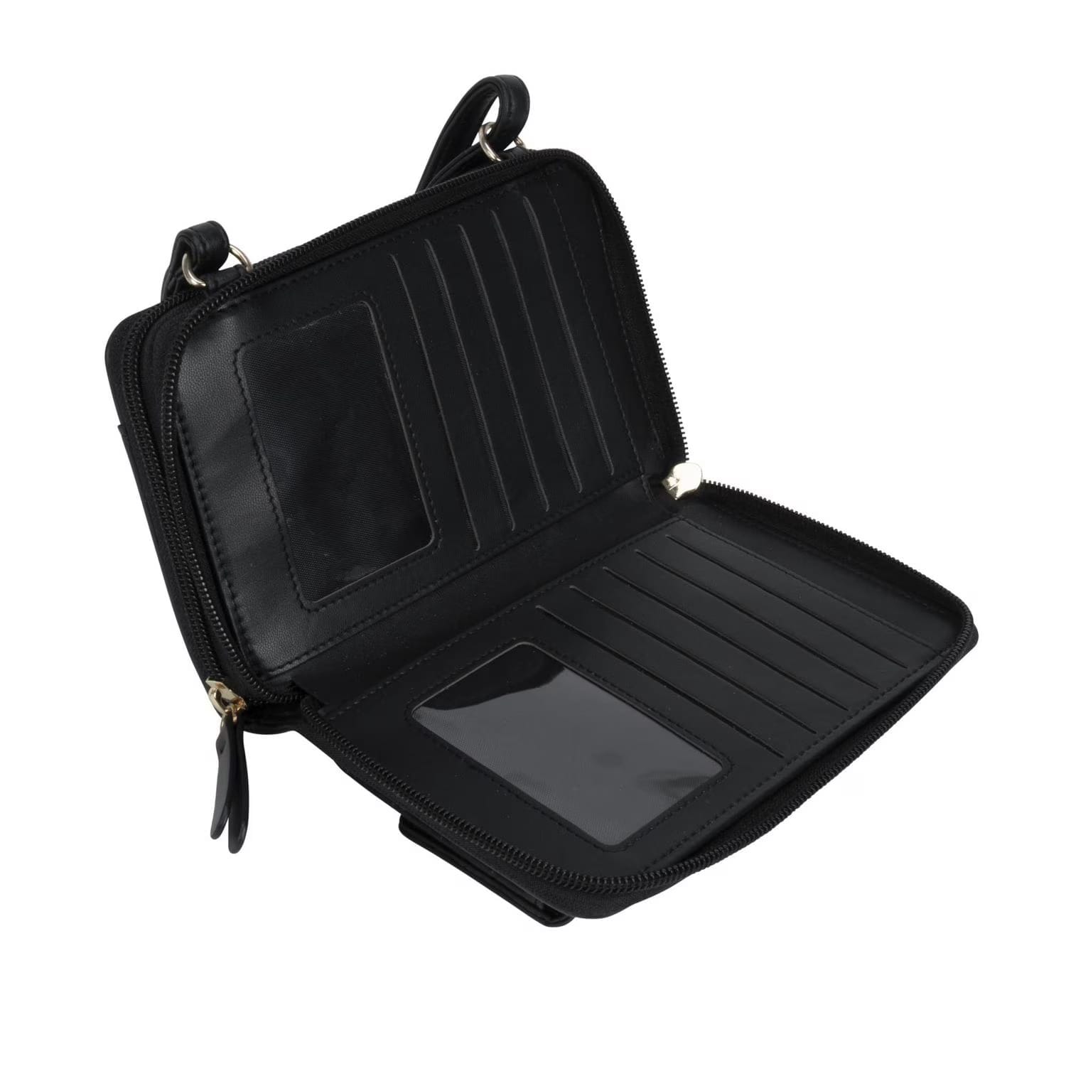 Wallet opens and closes with flap and snap. Crossbody strap. 8 card slots, 2 id windows. Multiple open compartments for cash and receipts. Two compartments with zipper closures.