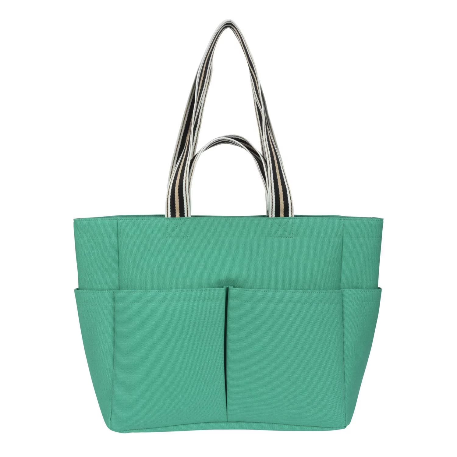 The Darlene Double Handle Tote meets all your needs for a prepped and packed beach day. This bag’s carry-all design has a deep interior and keeps your essentials easily accessible anytime. Secure your sunglasses, sunscreen, water bottle, bathing suit, towel and other belongings with the snap closure. Store smaller items in the front pockets, side pockets, or small interior pocket. Its long, multi-colour straps can be worn over the shoulder, while the shorter straps fit in hand. This lightweight tote can be a great addition to your next trip, weekend getaway, picnic or vacation.