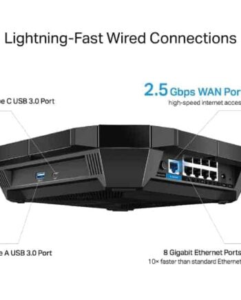 The Archer AX6000 provides a 2.5Gbps WAN port6 to make fully use of the over 1Gbps internet access, boost the whole internet throughput. one Type C and one Type A USB 3.0 ports and eight Gigabit Ethernet ports also help to transfer data at blistering speeds for peak performance.