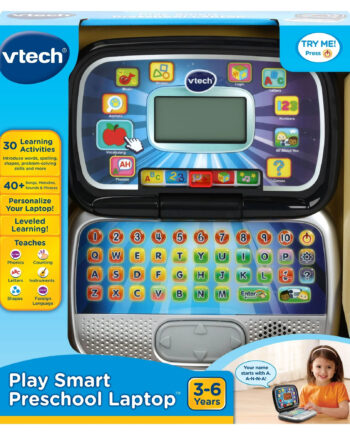 Little learners can get a smart start with the Play Smart Preschool Laptop. Five categories of leveled learning offer 30 activities plus an All About You section to let kids personalize their laptop. Start with Letters and Words with eight activities that reinforce letters, letter sounds, spelling and letter order. A Spanish activity teaches Spanish letters, numbers and first words. In Numbers and Shapes, eight games and activities include counting, skip counting and number order. Other play activities are Animals and Foods, Logic and Games, and Music Time. A friendly penguin is your child’s companion as they explore all the laptop has to offer. This sleek, black toy laptop has a 26-letter keyboard with 10 number keys to help kids get familiar with the QWERTY keyboard as they play games and activities. Intended for ages 3-6 years. Requires 2 AA batteries. Batteries included for demo purposes only. New batteries recommended for regular use.