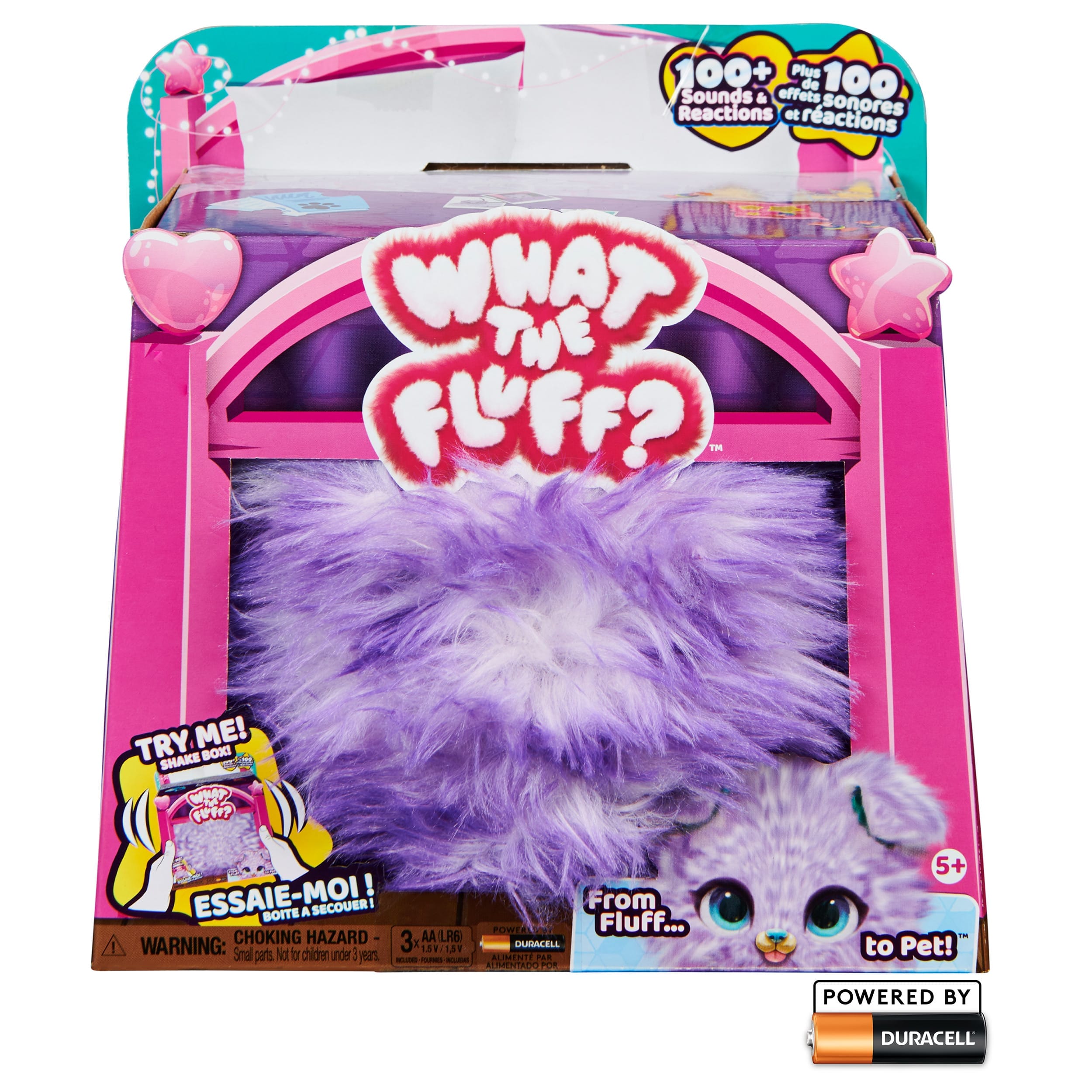 Introducing What the Fluff: fluffy interactive pets looking for their fluff-ever home! These super cute toys for kids feature over 100 exciting sounds and reactions and have a surprise pet reveal! Hidden inside a soft purple fluff is Pupper-Fluff. Play with your shy and timid What the Fluff toy to encourage her out of hiding and earn her trust. You can pet, roll, shake, toss and turn her upside down – when your fluff is feeling more comfortable, she reveals her ears! Keep playing, and her eyes will peek out, too! Once Pupper-Fluff fully trusts you, you’ll hear the celebration song and she’ll transform from fluff to pet! As you play, you’ll unlock Pupper-Fluff’s sweet and silly personality. With so many sound effects and reactions, you never know what adorable response you’ll get! This little fluff loves to eat, roll, snuggle, dance, sing and more. There are so many ways to play in both fluff and pet mode! She purrs and coos when pet, giggles and wiggles when tickled and gets dizzy if shaken. Toss your new friend in the air or turn her upside down to see her somersault! In fluff mode, feed her and scare away hiccups, play a game and more. You can even have a dance party with your What the Fluff! Tilt your pet left and right to play music and touch Pupper-Fluff’s head to hear her sing. Shake, toss and tilt your pet for even more music sounds, like a cute high note! At any time, transform your What the Fluff pet back to fluff, or change from fluff to pet again and again. For more fluffy fun, look for What the Fluff Purr ‘n Fluff (sold separately)! What the Fluff toys are perfect for pretend play and make great birthday gifts, Christmas gifts or gifts for kids aged 5 and up for any occasion. Each What the Fluff measures approximately 7 in. in diameter. Includes 3 AA batteries. Discover the sweetest surprise with What the Fluff!